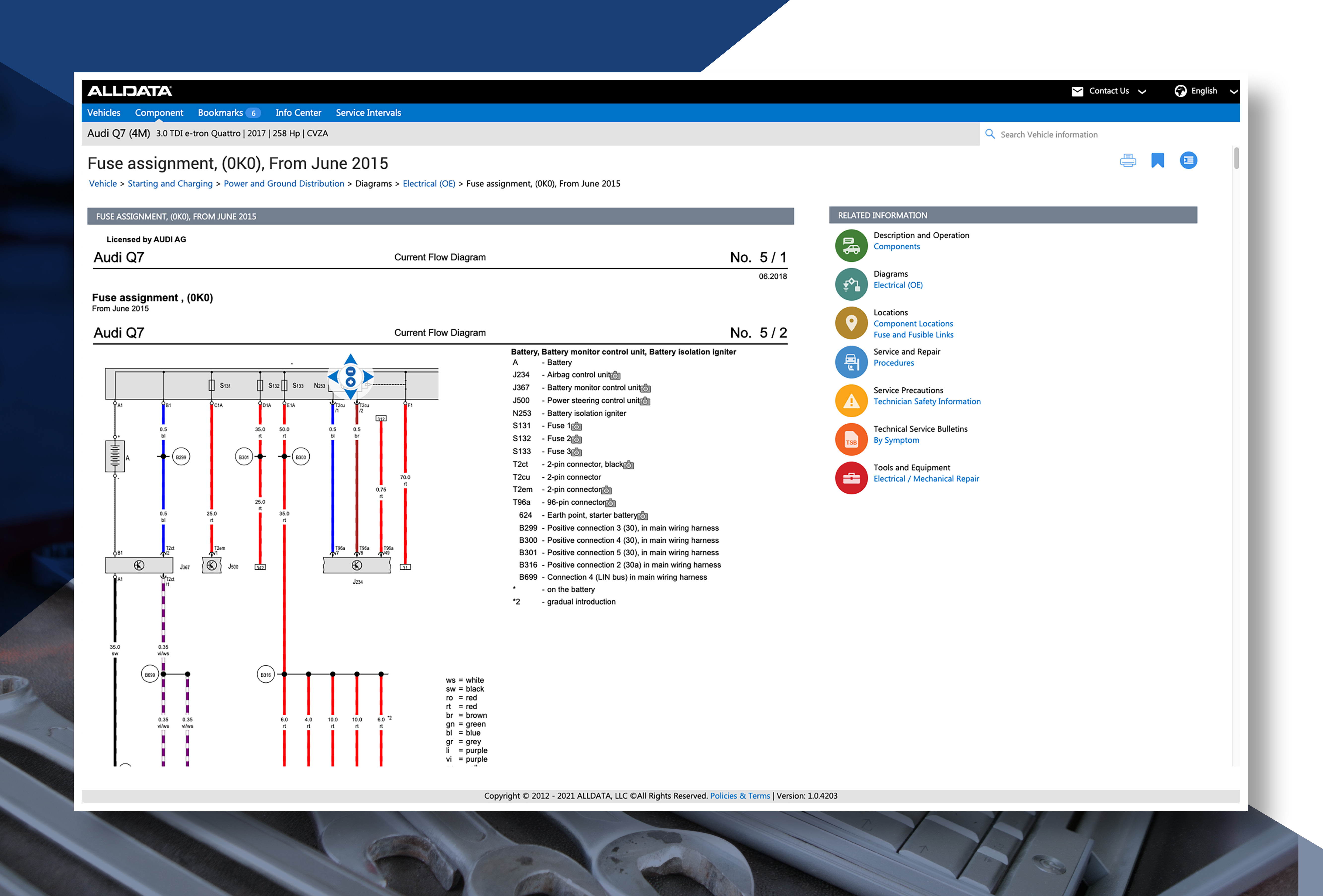 ALLDATA Repair® is the industry's leading automotive repair software. It puts the latest OEM repair information right at your fingertips, covering more than 144,000 unique vehicle combinations—over 96% of all vehicles on the road today from 41 vehicle manufacturers. The software includes TSBs, DTCs, and more than 8.5 million technical drawings and schematics, including electrical connection views.